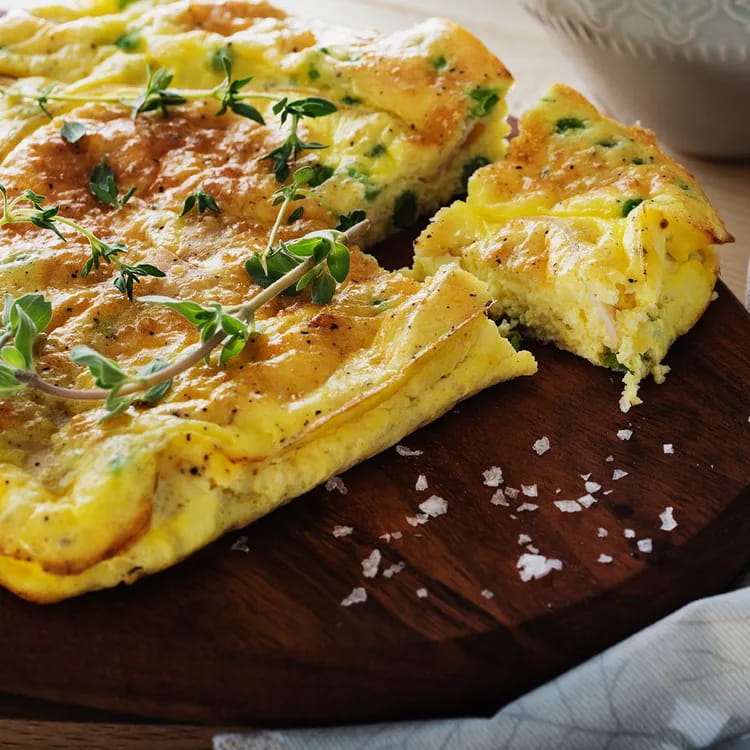 Servieren Sie Ihr Ofen-gebackenes Omelett warm oder bei Raumtemperatur, füllen Sie es mit weichem Käse, Wurstwaren und gegrilltem Gemüse!