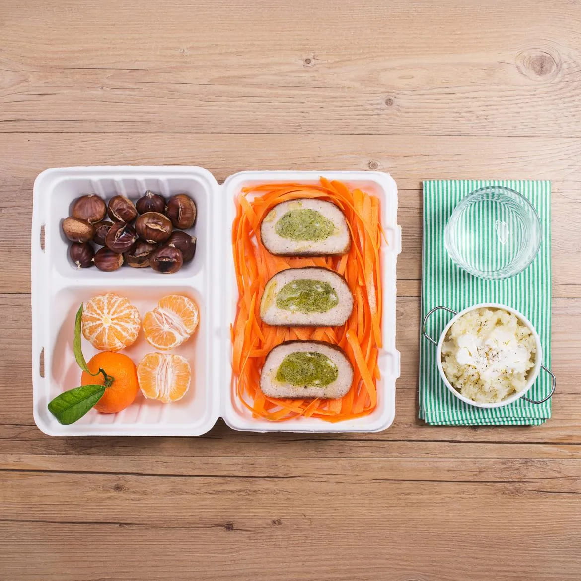 Today we propose a winter lunchbox perfect for the lunch break in the office: BonRoll with carrot salad, cauliflower cream, roasted chestnuts and mandarins. In this preparation, the AIA Spinach BonRoll is the real protagonist and is served in slices on a bed of carrot salad.