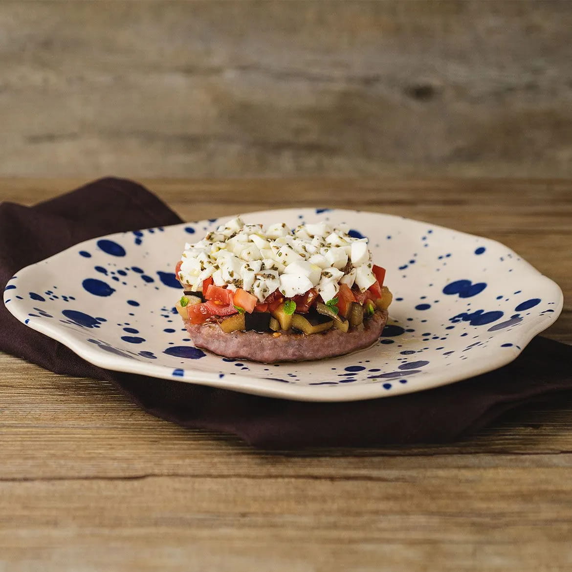 Heat the griddle and cook the AIA Pure Pork Burgers on both sides. Place the pork burger on the plate and, using a food ring, add the layer of mint eggplant, the seasoned mozzarella, and the cherry tomatoes.