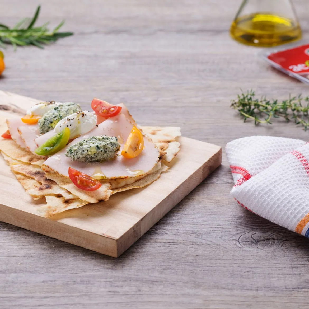 The recipe for the carasau bread sheet with aeQuilibrium, herb pesto, cherry tomatoes and ricotta comes from the idea of proposing a crunchy and unusual variant compared to the usual sandwich. In this preparation, the carasau bread gives crunchiness and lightness to the dish, while all the other ingredients offer softness, color and creaminess.