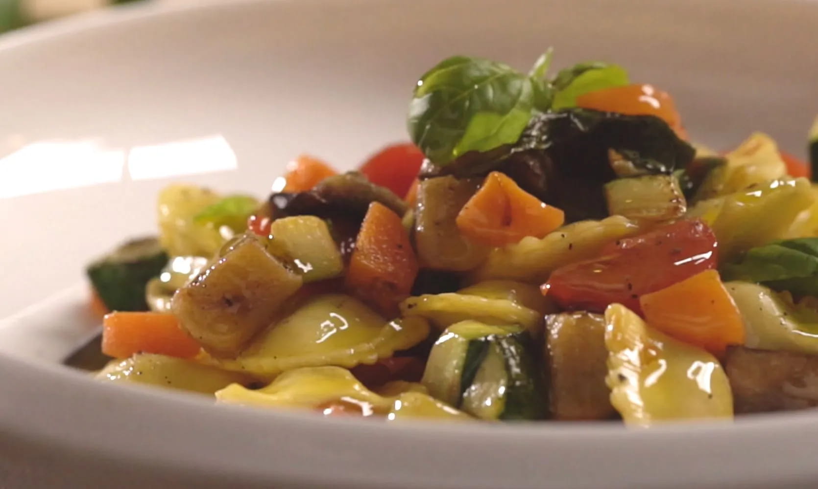 Wash the vegetables and cut them into cubes. In a large pan, fry the garlic clove in extra virgin olive oil. Add the vegetables and sauté them. Adjust with salt and pepper. Boil the raviolini in plenty of boiling salted water, drain them once cooked and dip them in the vegetable dressing.