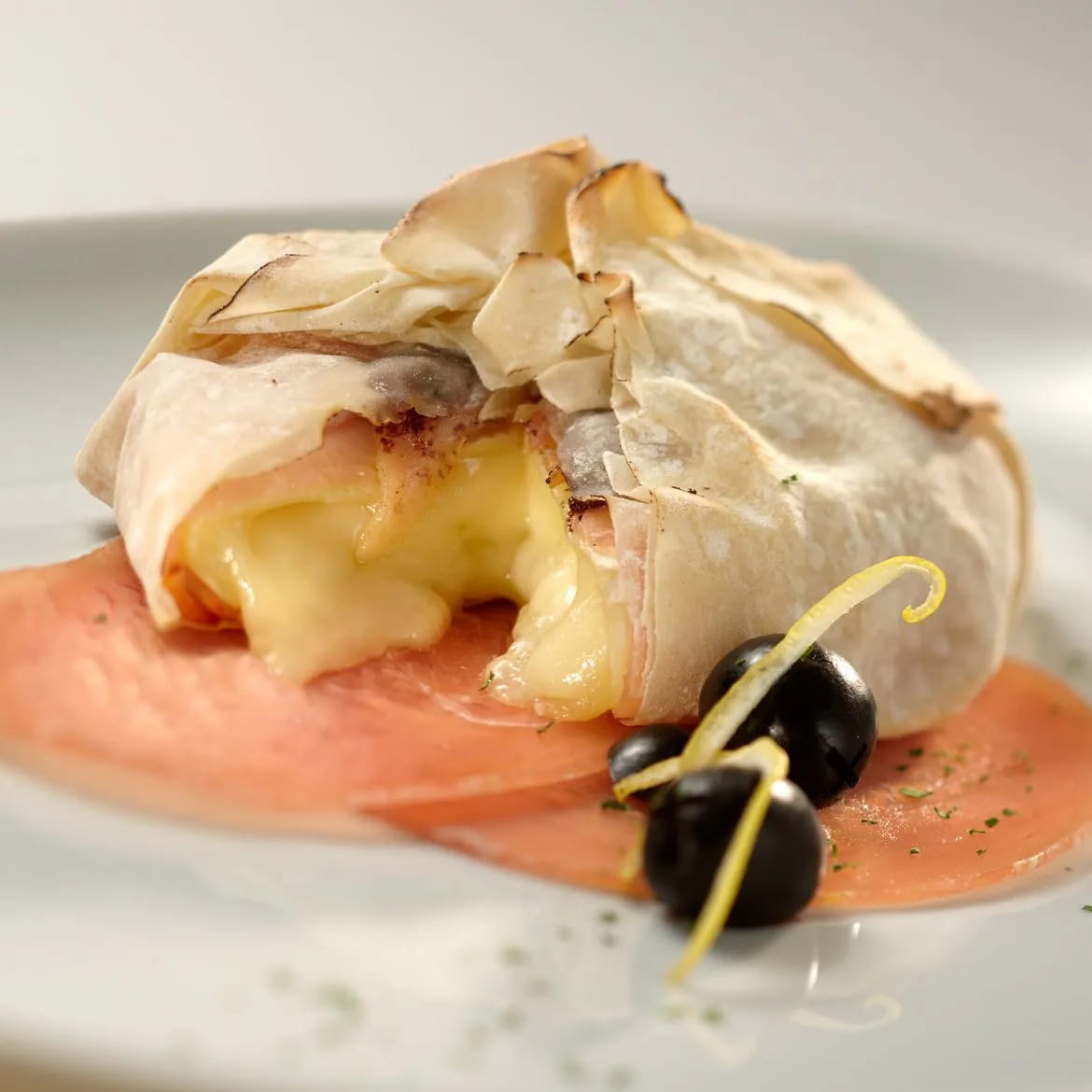To prepare the crispy bundle, spread a little olive paste on each tomino and then wrap it in slices of AeQuilibrium AIA turkey bresaola.