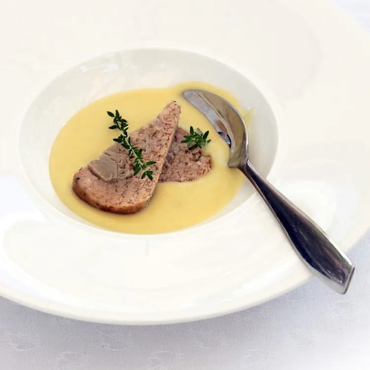 In the last ten minutes you will also put the potato flans in the oven that you will have prepared following this procedure: peel the potatoes, slice them and toast them with a little butter in a pan together with the thinly sliced spring onions. Add the vegetable broth and let it stew.