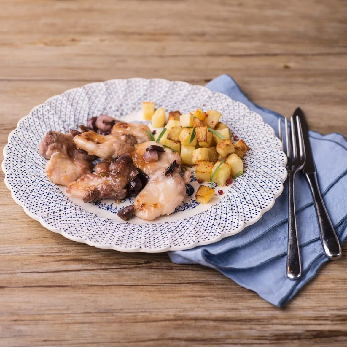 In this recipe, the AIA rabbit loin chops marry perfectly with the olives and harmoniously combine with the roasted potatoes.