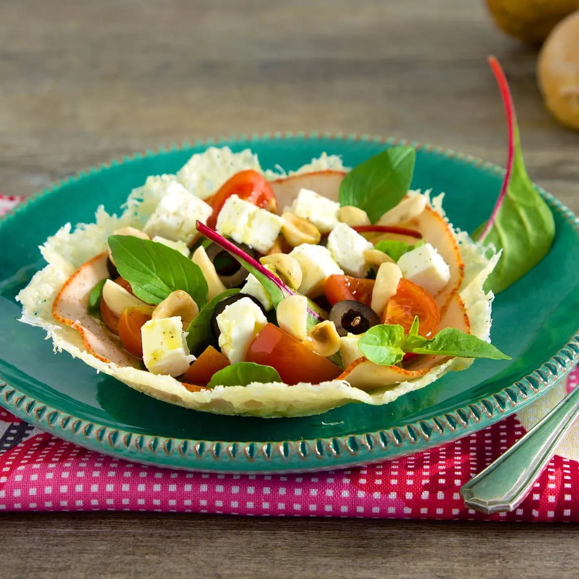 Tired of the usual salad? Why not try something different and delicious like the sweet paprika aeQuilibrium salad in a wafer? It's a really simple recipe to prepare, which will make a simple light salad more beautiful and tasty, in a mix of crunchiness and delicacy, given by the combination of AIA sweet paprika aeQuilibrium with the crunchy parmesan basket. You can enjoy this dish for a quick lunch or during a gallant dinner to surprise your sweetheart with something original and at the same time light.