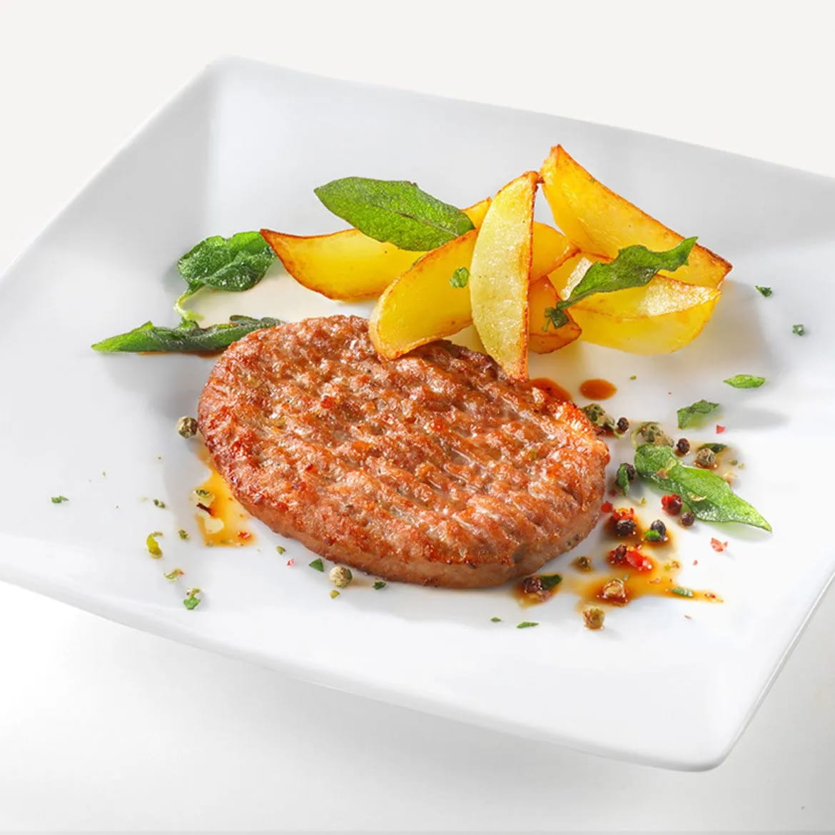 Be careful not to burn them, the sage leaves cook in a flash. In the meantime, cook the turkey burgers on the grill and then arrange them on a plate with the potatoes and decorate with the fried sage leaves.
