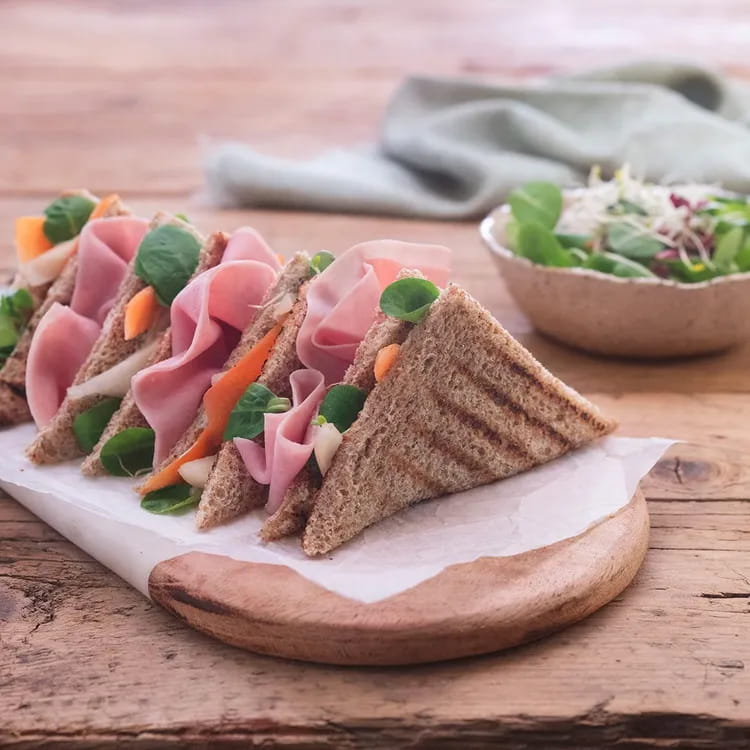 Toast the cereal bread and, when it is crispy, cut it into squares.