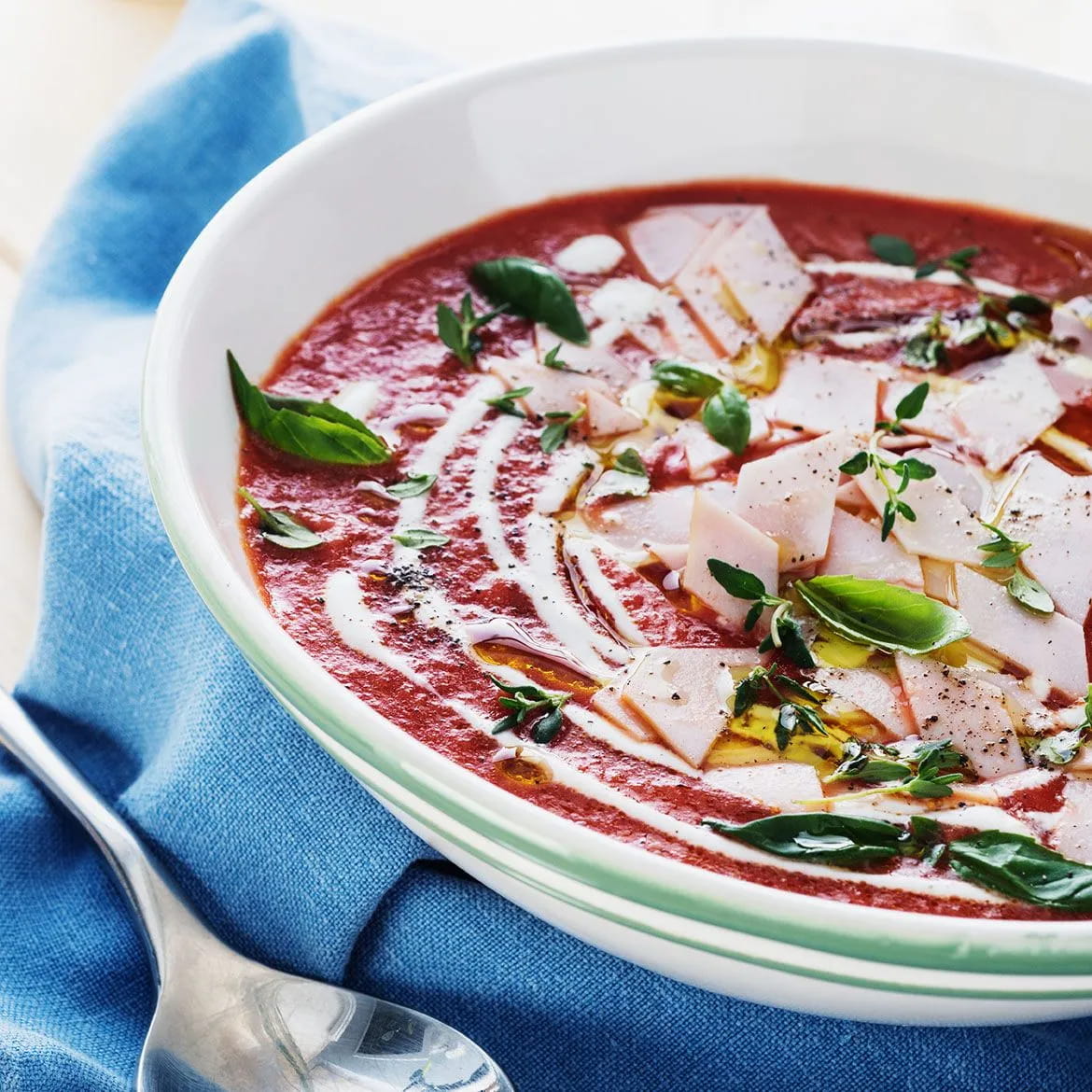 Le zuppe ci fanno sempre pensare alle fredde serate d’autunno o, in generale, al periodo invernale: in questa preparazione, però, la zuppetta di pomodori è fredda e viene insaporita dal Petto di Tacchino al forno AeQuilibrium di AIA, per diventare un piatto perfetto da gustare nel periodo estivo, perché fresco e leggero.