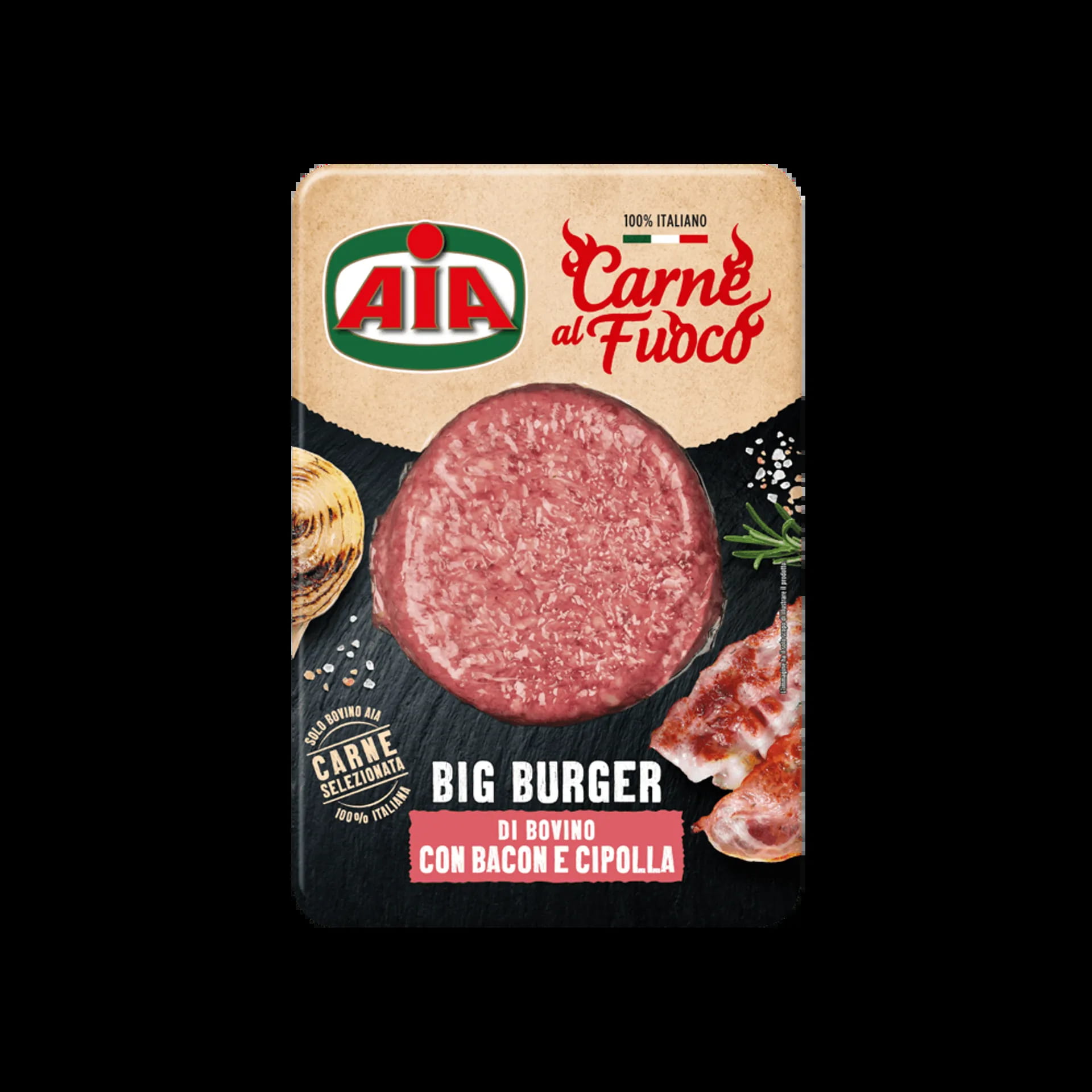Il Big Burger AIA si arricchisce di gusto grazie all’aggiunta del bacon a cubetti e della cipolla, che lo rendono ancora più appetitoso e irresistibile. 100% carne selezionata da AIA.