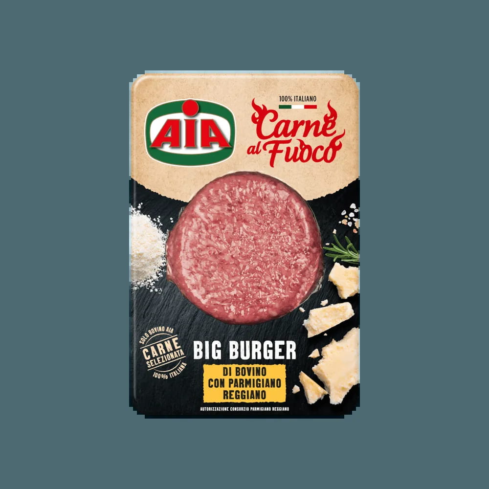 Il big burger AIA si fa ancora più gustoso grazie all’aggiunta del Parmigiano Reggiano, l’ingrediente che lo rende ancora più appetitoso e irresistibile. 100% carne selezionata da AIA.