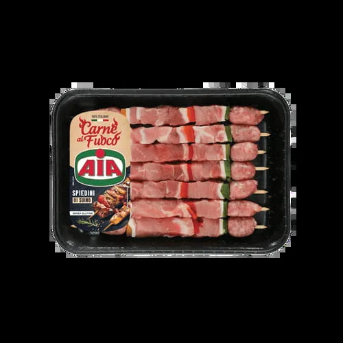 Spiedini di teneri tagli di suino, separati da peperoni e sfoglie di pancetta, accompagnati all'estremità da due chicchi di salsiccia. SENZA CONSERVANTI.