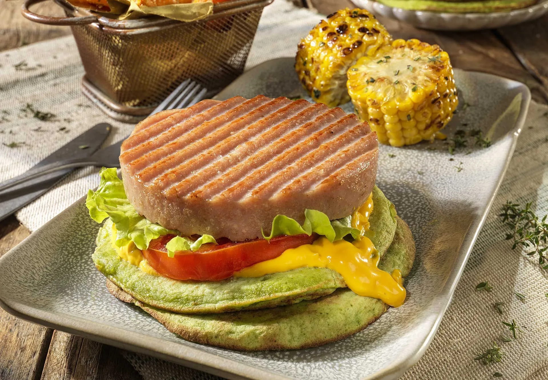 - Burger con pancake di piselli, patate dolci croccanti e pannocchie grigliate
