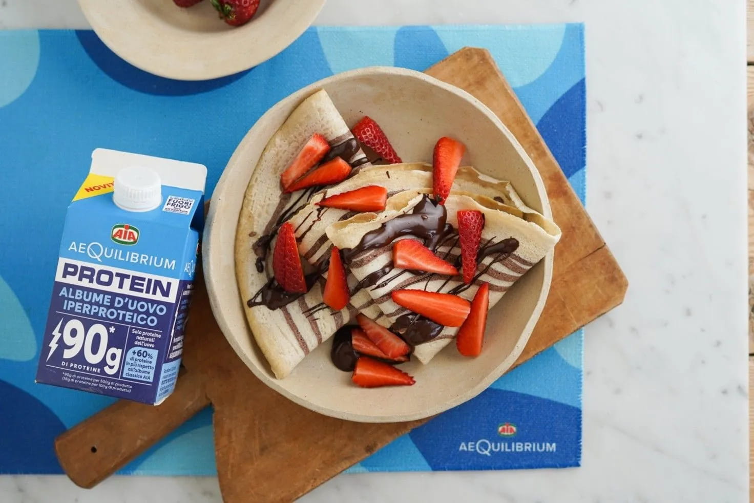 Le crêpes dolci bicolor sono caratterizzate da un originale effetto a spirale ottenuto combinando un impasto bianco all'avena con uno arricchito al cacao. La consistenza leggera si sposa perfettamente con la cremosità dello yogurt greco e la freschezza delle fragole. È la scelta ideale per chi vuole iniziare la giornata con un tocco di creatività e una ricarica di energia proteica.