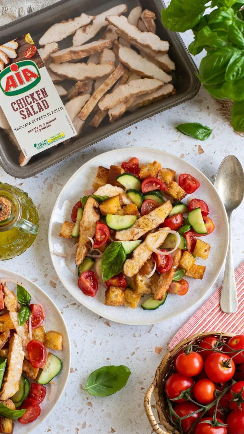 Aggiungete alla panzanella anche la tagliata di pollo AIA. Completate con qualche fogliolina di basilico fresco.