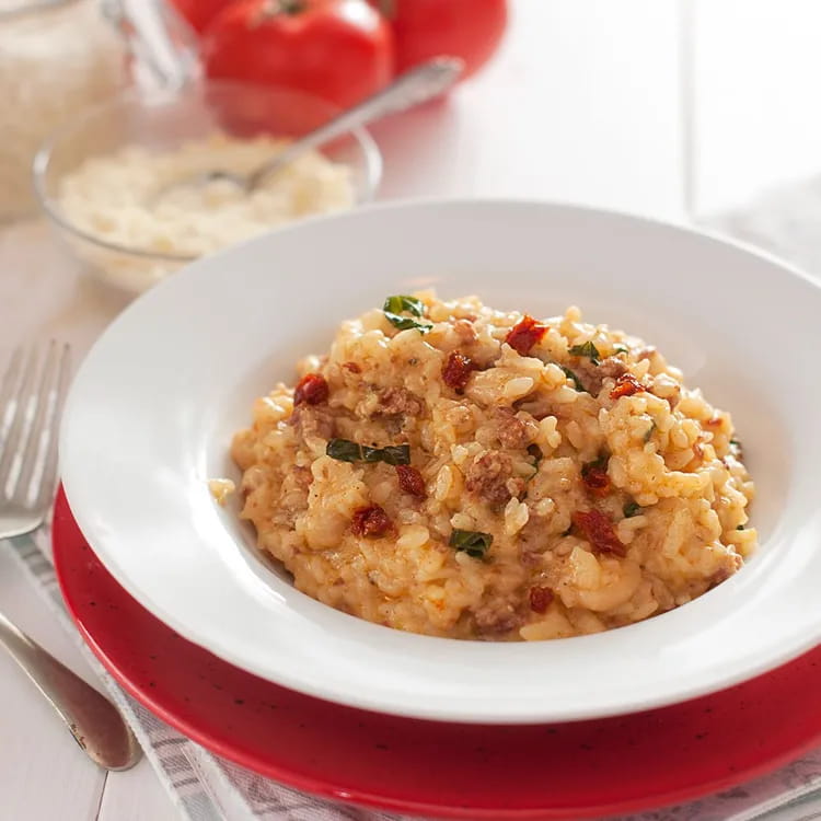 - Risotto al pomodoro con salsiccia, ricotta e menta