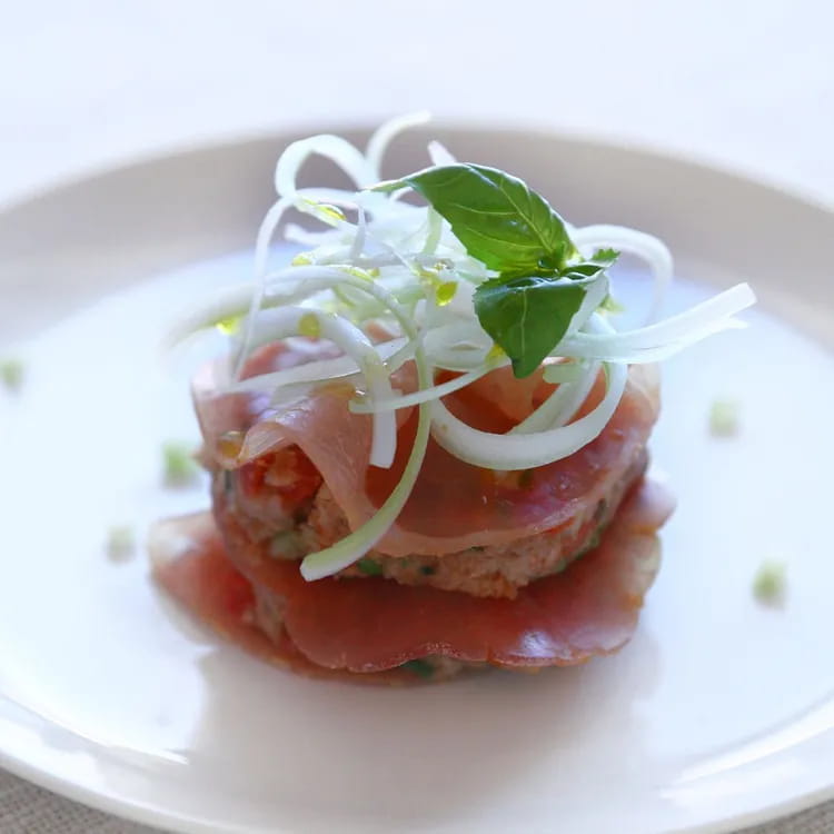 Su un piatto di portata o nella vostra schiscetta per il pranzo, sistemate l’affettato di petto di tacchino aeQuilibrium e disponetevi sopra l’insalatina di asparagi e pomodori.